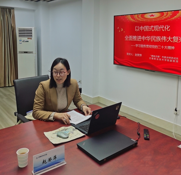 党总支特别邀请了理响无锡市委讲师团成员、马克思主义学院赵癸萍副教授作了题为“以中国式现代化全面推进中华民族伟大复兴”的党的二十大精神宣讲报告,报告从“奏响中国式现代化的时代强音”、“谋划中国式现代化的战略部署”和“吹响中国式现代化的奋进号角”三个方面阐述了大会的基本概况、主要内容和历史意义。随后,学院班子成员朱倩、徐安林、徐进三位同志分别围绕主题结合部门工作实际作了重点发言,其他同志补充发言。此外中心组全体成员参加了理论知识应知应会测试。在学习总结中,朱倩强调了学习党的二十大精神的重大意义,号召部门全体同仁凝聚力量、团结奋斗将校党委对双创学院“大有可为”的殷切期待转化为“大有作为”的生动实践。