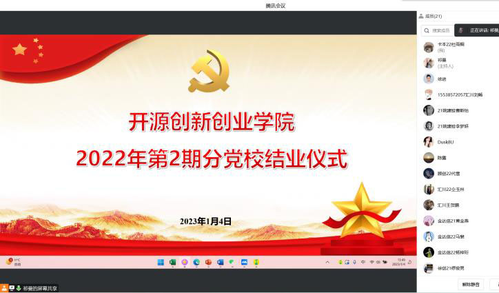 学习二十大,奋进新征程。为深入学习贯彻党的二十大精神,做好学生党员培养,引领青年学生明确第二个百年奋斗目标的使命担当,2022年12月至2023年1月,开源创新创业学院举办2022年第2期分党校,并于1月4日圆满结束,参与党校培训的21位学员,通过全面考核,全部合格结业。