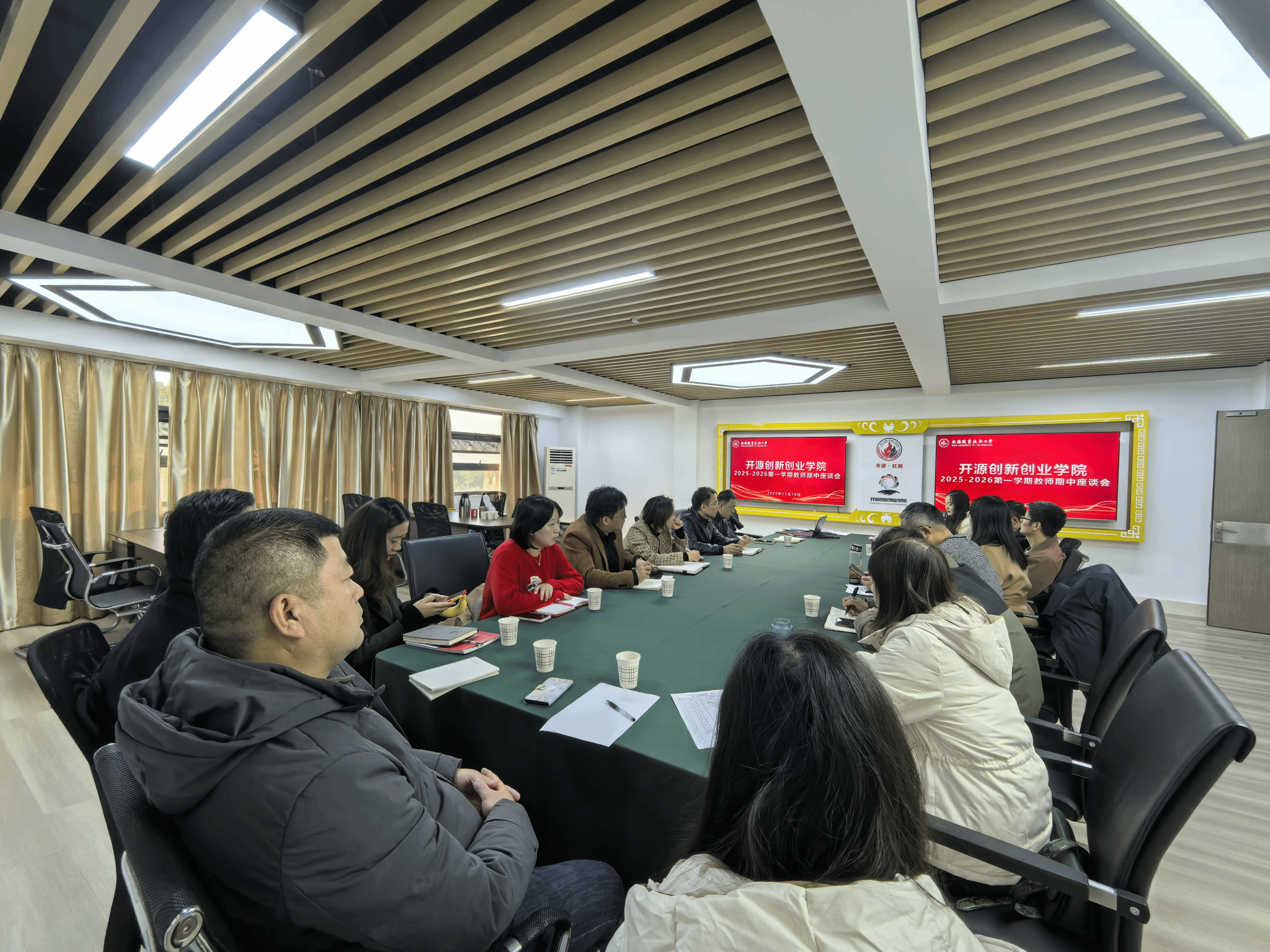 为深入贯彻落实“双高计划”建设任务,持续提升教育教学质量,加强师资队伍建设,开源创新创业学院于2025年11月18日下午在智能制造工程中心302会议室召开2025-2026学年第一学期期中教师座谈会。会议由董梅艳老师主持,学院院长刘全胜出席会议并致辞,职能部门潘宇婷老师和罗海涛老师列席,《创新思维》课程全体授课教师参加座谈。