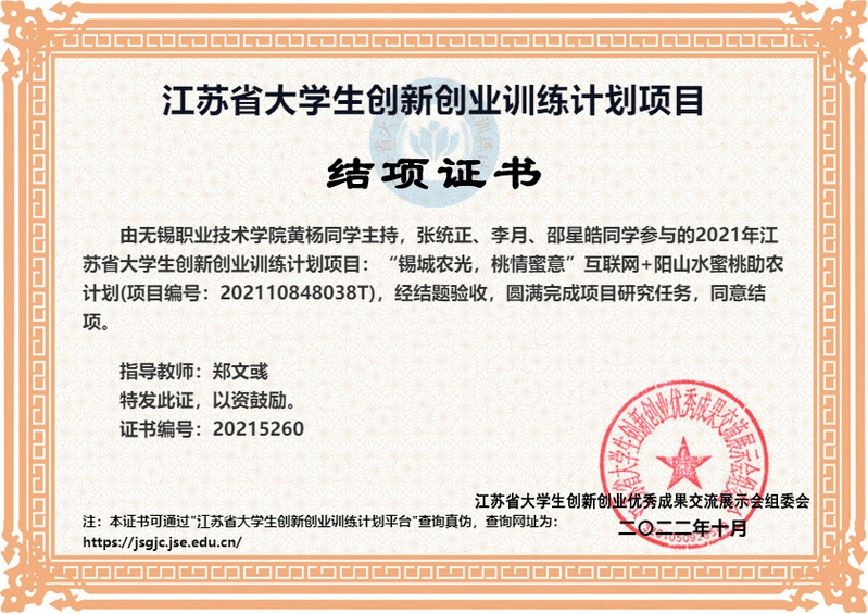 2021年江苏省大学生创新创业训练计划项目结题证书