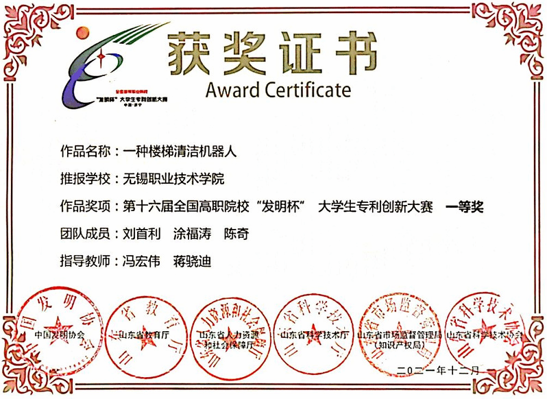 第十六届全国高职院校“发明杯”专利创新大赛获奖奖状