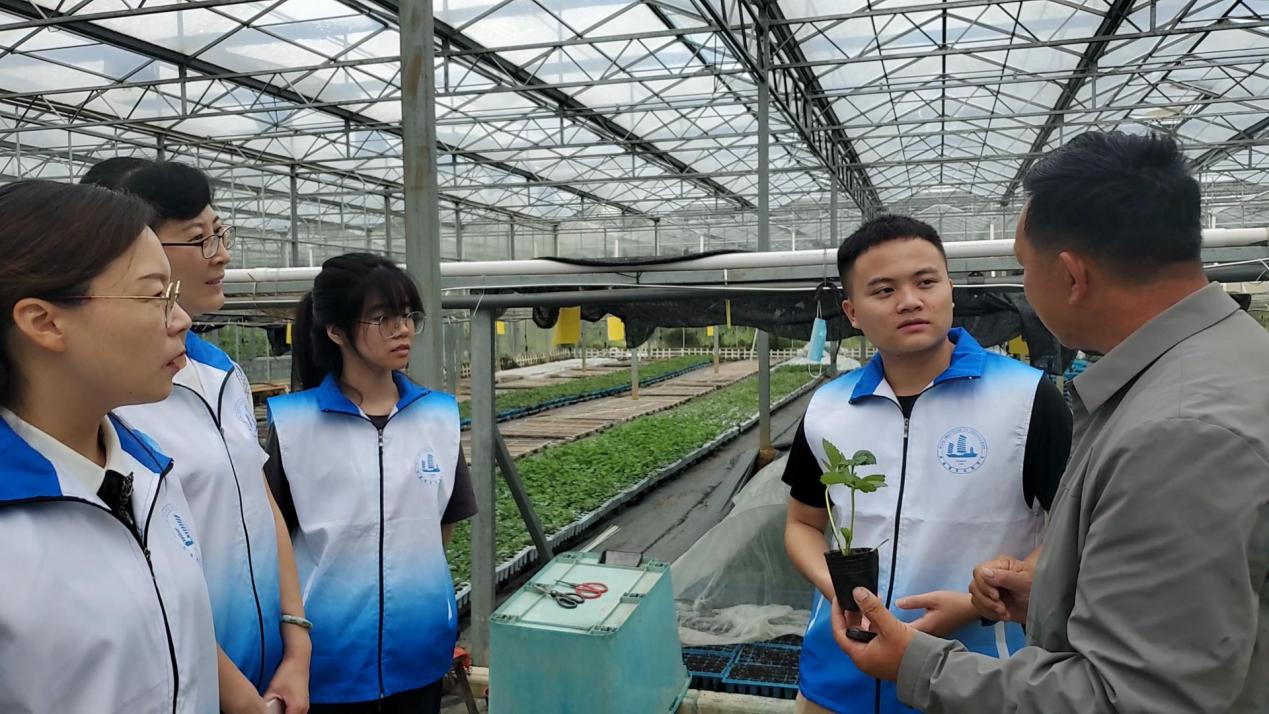 图为王朝荣向实践团师生介绍幼苗移栽过程