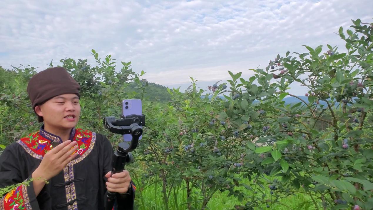 图为实践队队长杨义刚在蓝莓采摘基地体验直播。