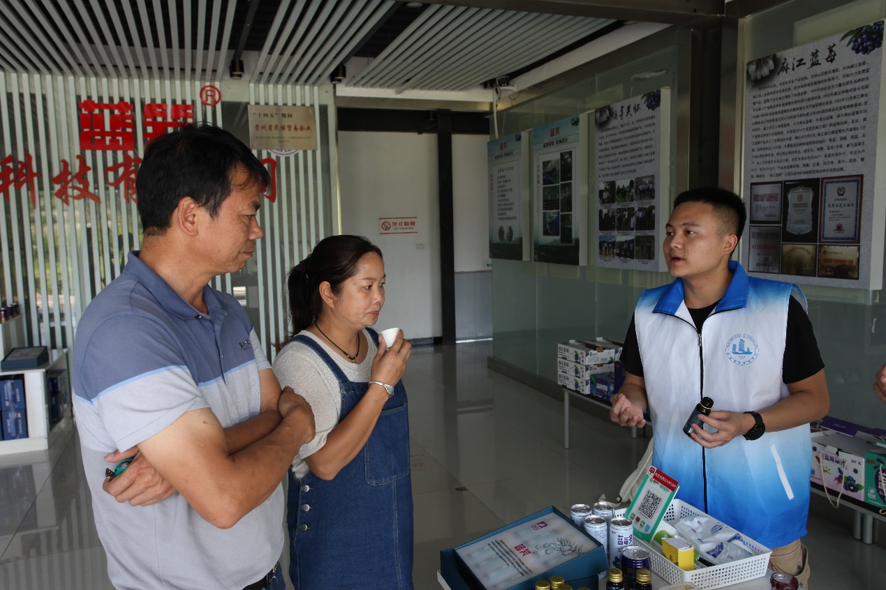位于麻江县蓝梦谷景区的贵州蓝瑞农业科技有限公司主营蓝莓果汁、蓝莓红酒、蓝莓原浆等系列产品,拥有6条蓝莓产品自动生产线,年产能达3000吨左右。“每年我们向农户收购900多吨蓝莓,一部分鲜果经初加工为冻果后直接销售给省内外下游厂家。”贵州蓝瑞负责人徐先群说。通过“企业+合作社+农户”的组织方式,把低利润的原料进行加工,不仅仅带动当地农户实现增收而且有效维持蓝莓的新鲜多汁更有利于将当地产品外销。蓝瑞农业科技有限公司致力于绿色、健康食品,深耕可循环的生态农业产业,是一家集蓝莓种植、收购、加工、产品研发、生产、销售为一体的规模型综合企业,将蓝莓采摘后加工成蓝莓果干、蓝莓汁、蓝莓果粉、蓝莓果酱等系列产品。“‘麻小莓’是麻江蓝莓品质的保证,我们所有的蓝莓产品包装上都有‘麻小莓’和‘蓝笑’商标。这让消费者的认可度更高,更愿意购买。”徐先群表示,依托“麻小莓”公共品牌,本土企业实现了抱团发展,产品质量更有保证,市场更容易打开,企业发展更有底气。在牛经理的带领下实践队成员了解了企业规模及生产模式,并品尝蓝莓系列产品、体验销售,进入车间近距离观摩蓝莓加工生产线。以蓝莓加工为基础,强力推进蓝莓产业“全链条”发展,坚持“生态+”,打好“标准体系、高端产品、产权保护”组合拳,麻江蓝莓精深加工产业链日趋完善。