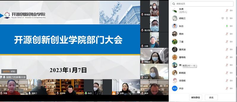 岁末年初,2022-2023第一学期即将结束。1月7日上午9点,双创学院全体教职工上线腾讯会议,共同参加期末部门大会。会议由学院党总支副书记徐进主持。